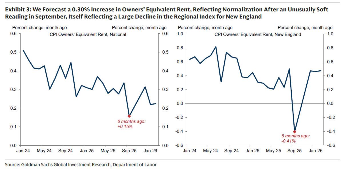 ②住房。高盛预测房钱类别将环比增长0.20%,发达和煦,反馈出其潜在趋势的握续放缓。高盛预测业主等价房钱(OER)类别将加快攀升至0.30%,反馈出9月极度疲软读数反弹带来的上行压力,而该读数自己反馈了新英格兰地区OER指数的较大幅度下跌。