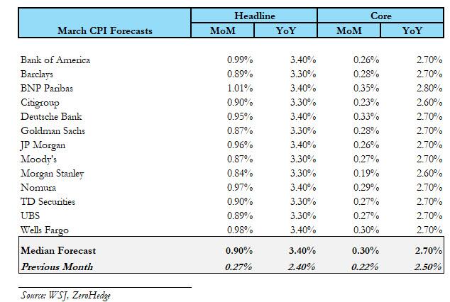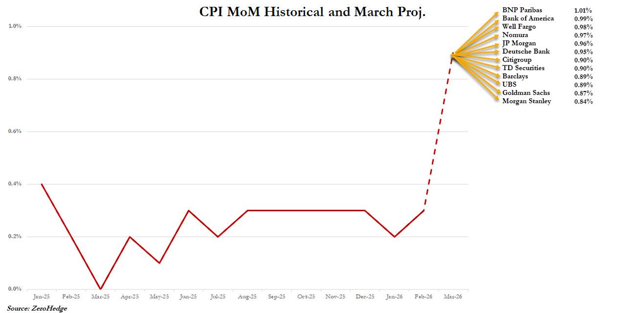 下图是面前华尔街投行对3月CPI环比数据的具体预测。不错看到,投行预估漫衍浩荡在0.8%以上,部分机构预测环比涨幅可能“破1%”。