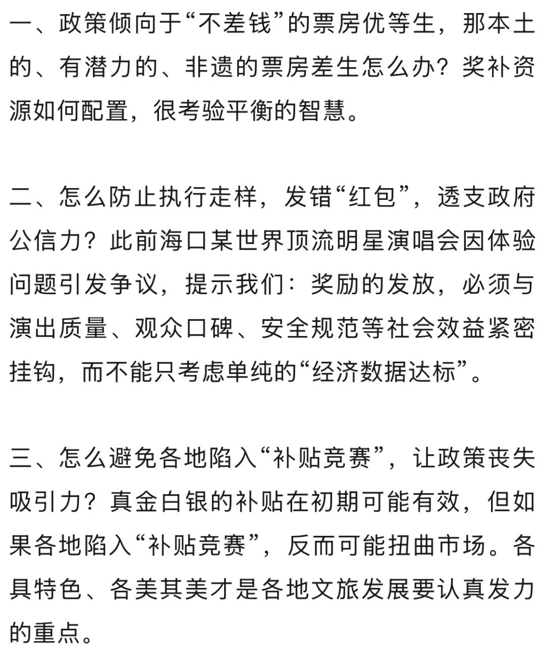 另外,奖励也并非针对明星个人,而是符合条件的主办单位。政策细则已经设计有清晰的门槛:售票人数、收入规模、岛外观众比例……其核心目的,是以一场高流量的顶级演出为“引爆消费”,拉动旅游、住宿、餐饮、购物、交通等。