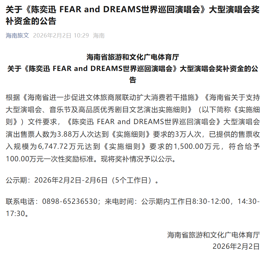 2月2日,海南省旅游和文化广电体育厅发布公告,公示陈奕迅、张学友大型演唱会奖补情况。具体内容如下: