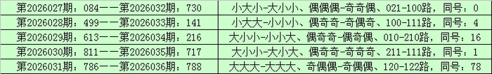 陈设三第2026032期-第2026036期相连5期奖号为:730-141-216-717-788。