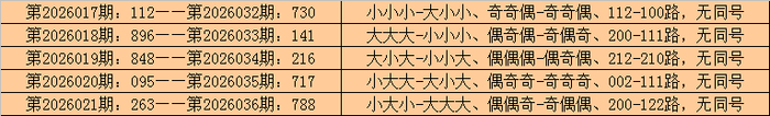 在陈设三历史开奖中,第2026017期-第2026021期相连5期奖号为:112-896-848-095-263。
